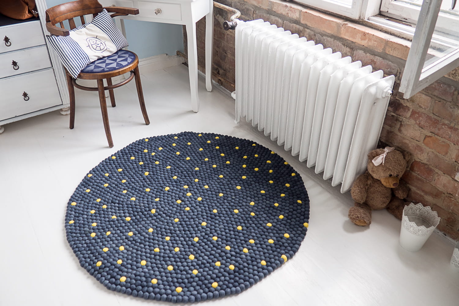 Postawienie stopy na takim dywanie to zupełnie nowe doznanie. Kulki są miłe w dotyku, a ich nieregularna powierzchnia masuje stopy. Zastosowana w nich sfilcowana wełna ociepla, wygłusza, oddycha… a przy tym jest w 100% naturalna.