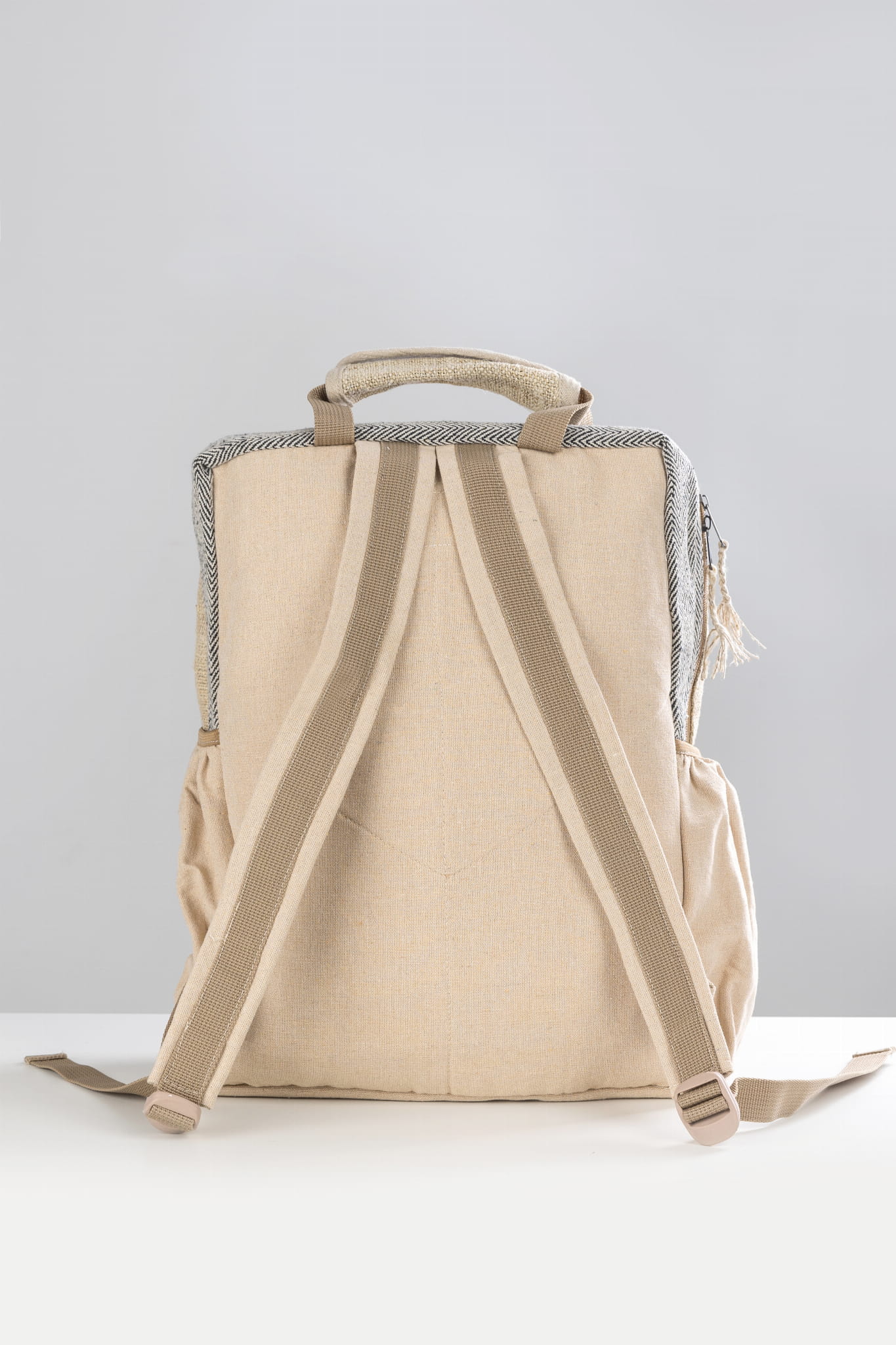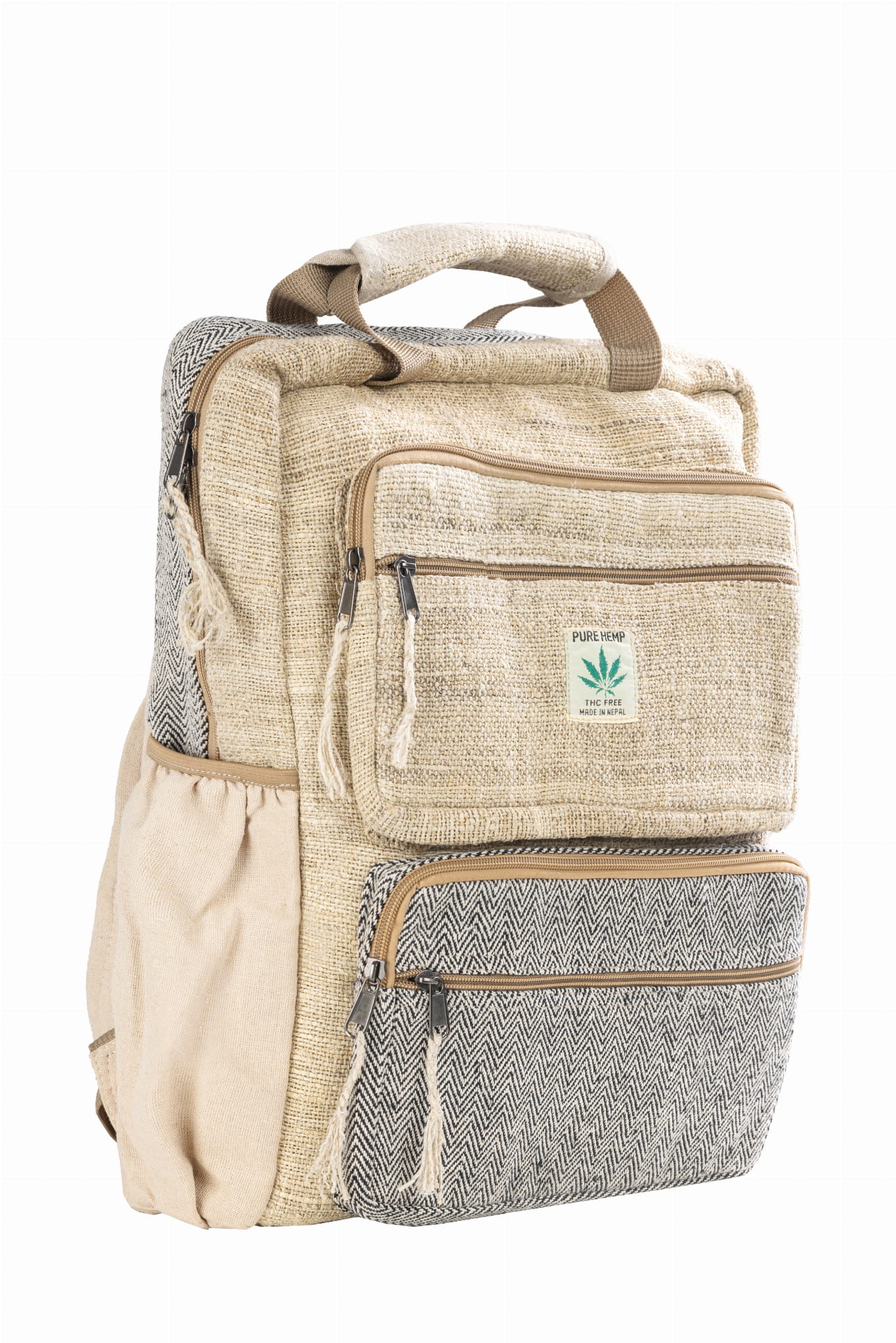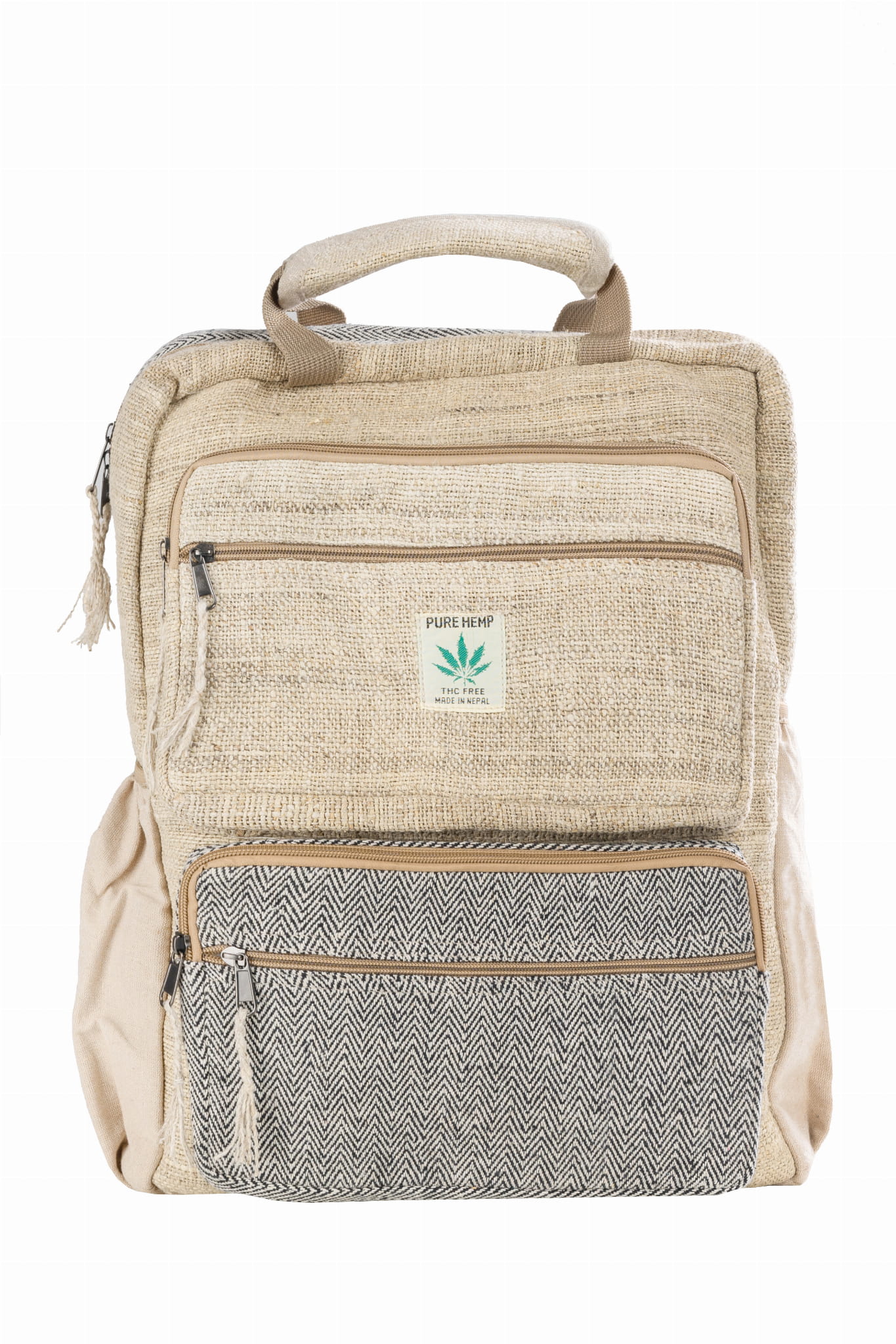 Plecak wykonany ręcznie w Nepalu z naturalnych włókien: konopi himalajskich oraz mocnej bawełny. Regulowane paski na ramiona. U góry rączka do wygodnego przenoszenia. Główna komora zamykana na zamek jest wystarczająco duża żeby pomieścić podręczniki, laptop ale także wszystko co potrzeba na weekendową wycieczkę. Dodatkowe kieszonki ułatwią organizację i przenoszenie mniejszych przedmiotów. Na zewnątrz po bokach plecaka dwie kieszenie na sprzęt podręczny, butelkę wody czy parasol. Ten oryginalny i kolorowy plecak świetnie sprawdzi się na co dzień ale także na wycieczki. Plecak wykonany jest w nepalskiej manufakturze z naturalnych materiałów zgodnie z zasadami Fair Trade. Wymiary 38 x 45 cm.