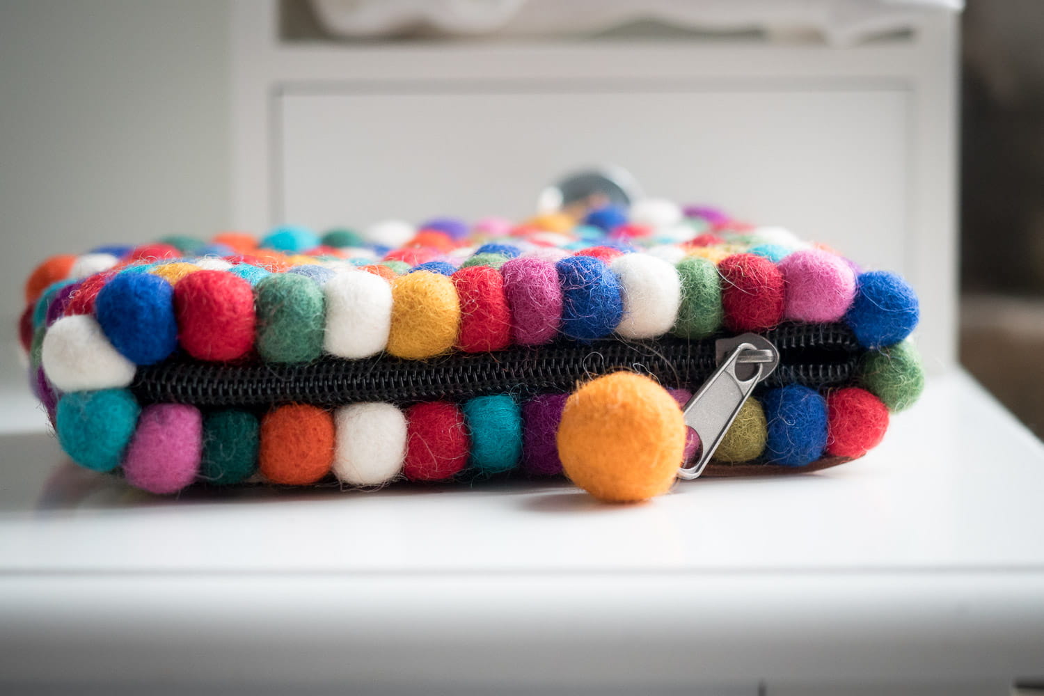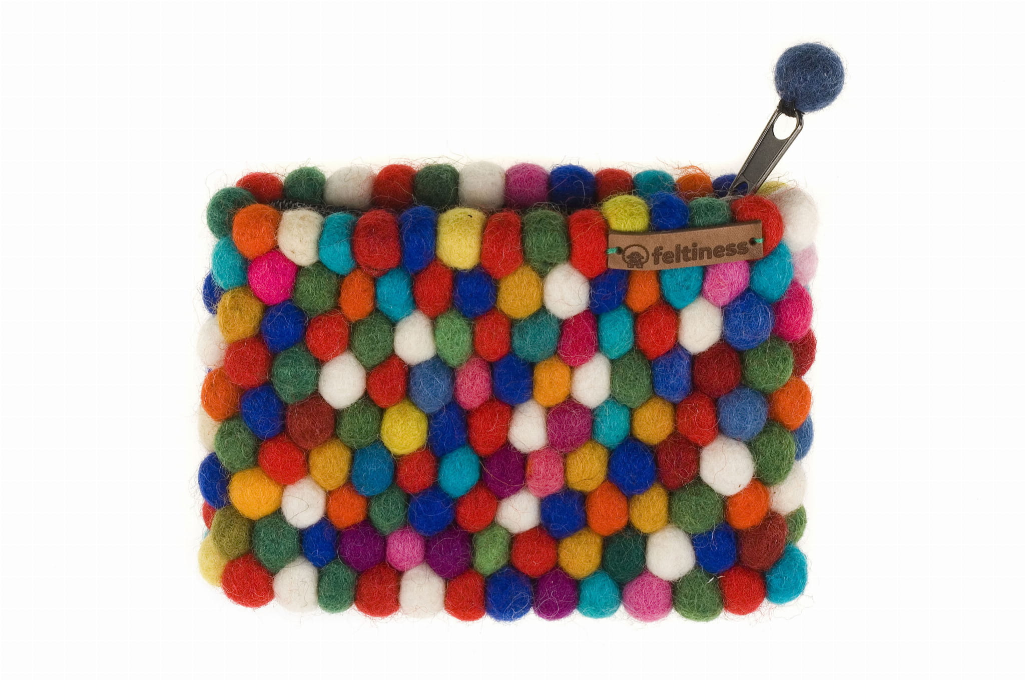 Przepiękny i niepowtarzalny portfelik wykonany ręcznie w Nepalu z filcowanych, wełnianych kulek o średnicy 1 cm. Zamykany na zamek błyskawiczny. Wnętrze wykończone bawełnianą podszewką.